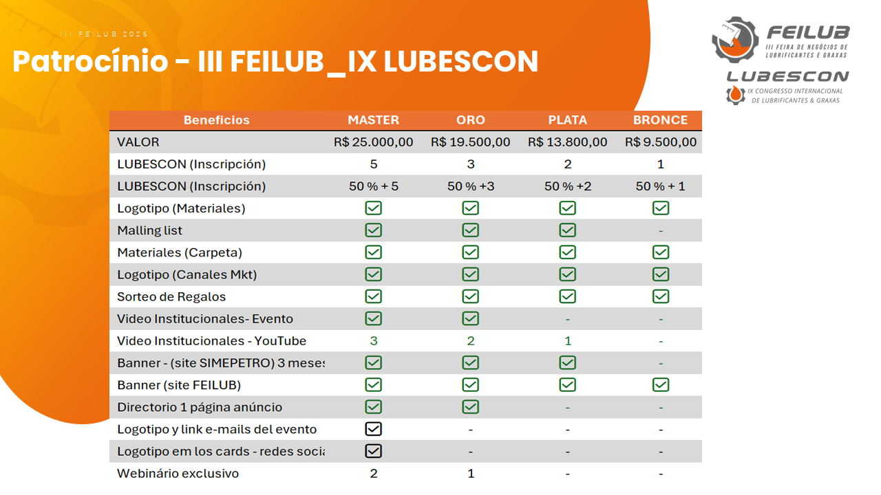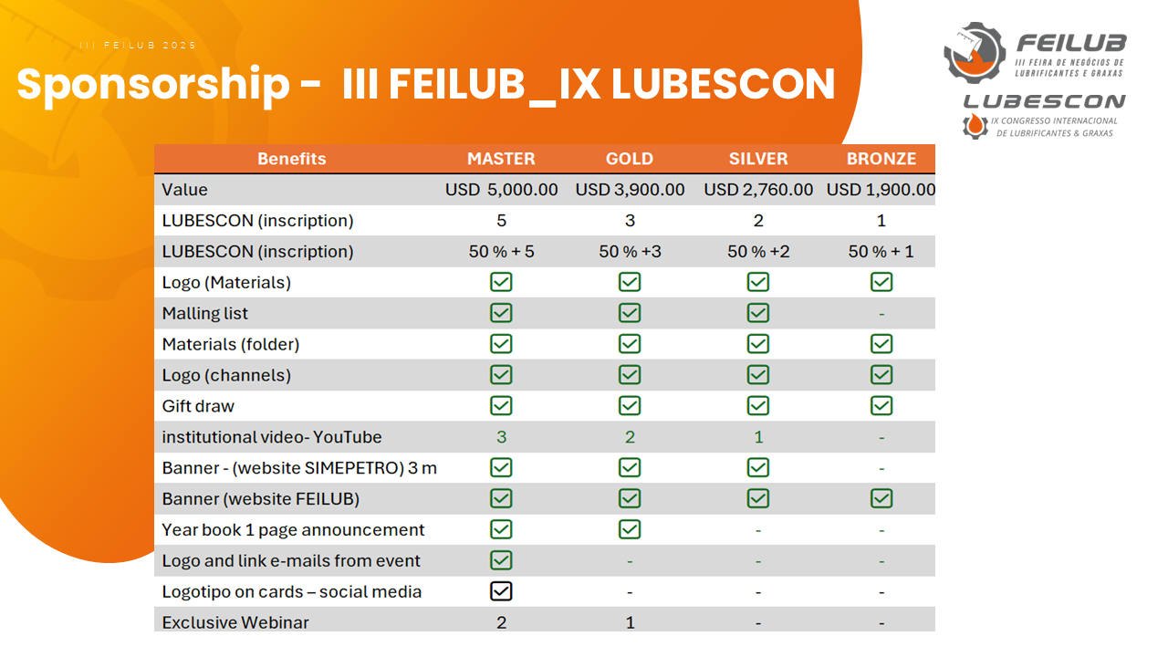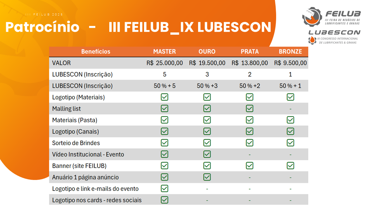 Faça parte do seleto grupo de patrocinadores do maior evento do setor. Sinônimo de tradição, inovação, networking e bons negócios. Registre sua marca no maior evento do mercado de lubrificantes da América Latina para o ano de 2025.